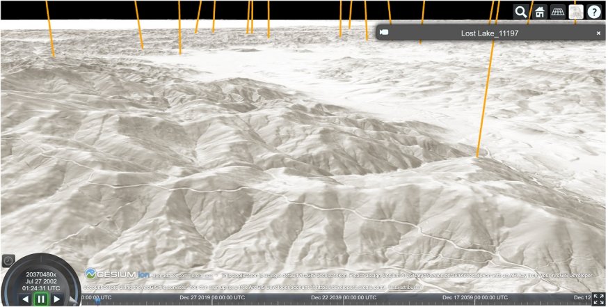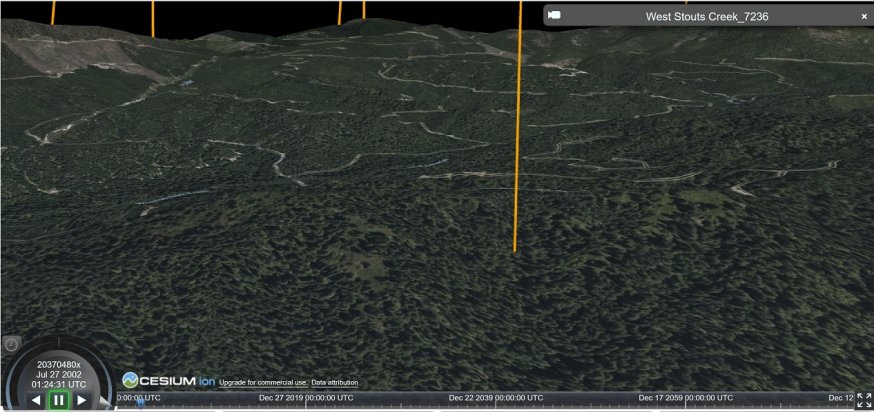 Cesium is meant to show animated 3d visuals on top of geospatial layers and projections, so it prominently features a timeline on the bottom. This is an interactive ui that allows the user to move forward and backward into arbitrary points in time, with any temporal data in the visual updating accordingly.