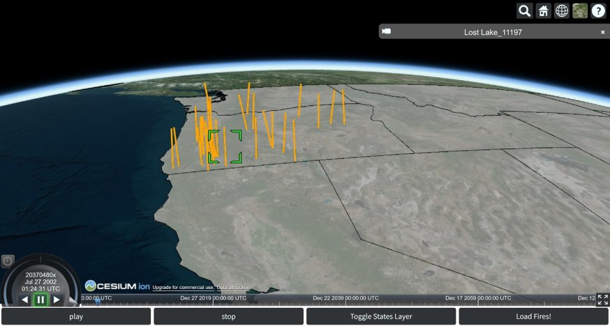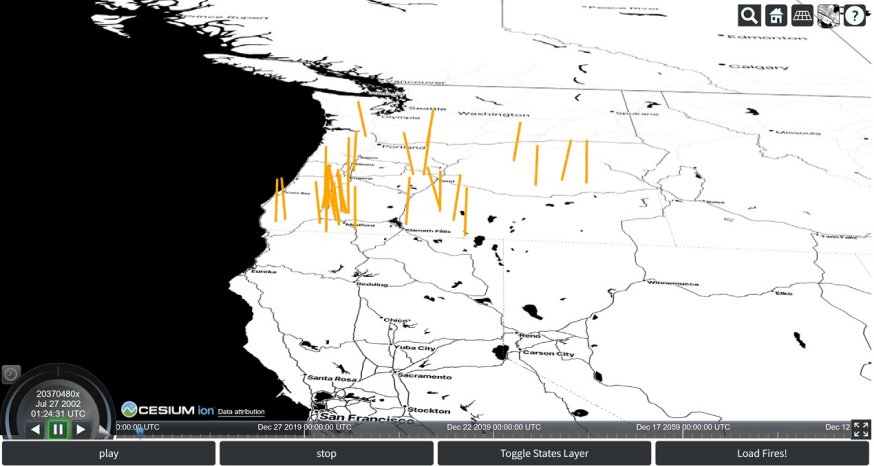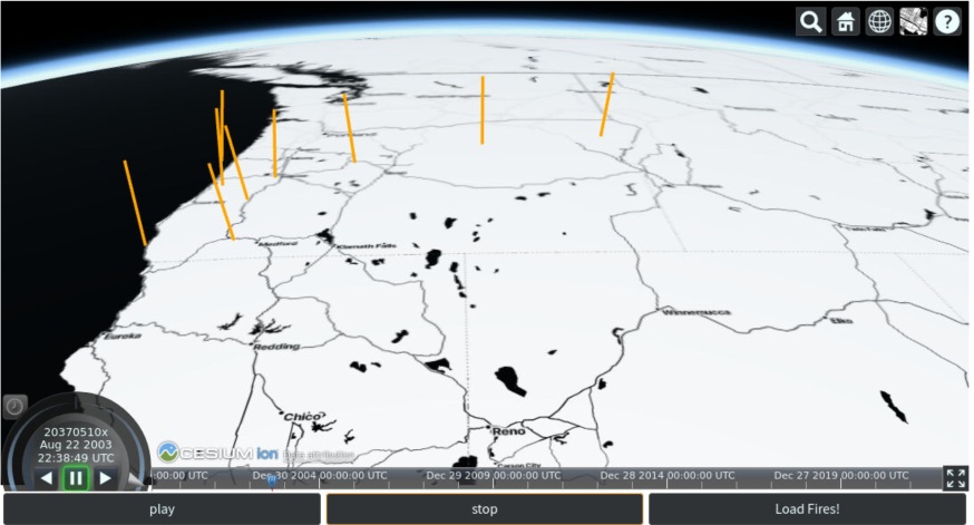 This is a short port of a more sophisticated cljs application that leverages CesiumJS for geospatial visualization, animation, and various interactive 3d projections. After seeing other civitas posts, I decided to try to port over a subset of the functionality in a “lightweight” package, combined with some analysis of open data (in this case, fires in Oregon), and then build up an interactive view/animation of the result.