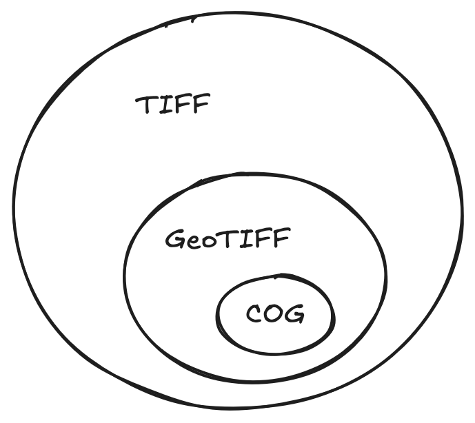 A COG is a raster (pixel by pixel image) file containing geographic information, for example a satellite photograph of a part of the surface of the earth. It is a TIFF (Tagged Image File Format), which is a common format for raster graphics. It is widely used for images produced in scientific imaging. TIFF is an extensible metadata format, allowing for specifications to be built on top of it. One such specification is GeoTIFF, which requires additional geographic metadata. Cloud Optimized GeoTIFF is a sub specification of GeoTIFF that uses the TIFF metadata and multi image storage to allow for efficient partial reads over HTTP using ranged requests.